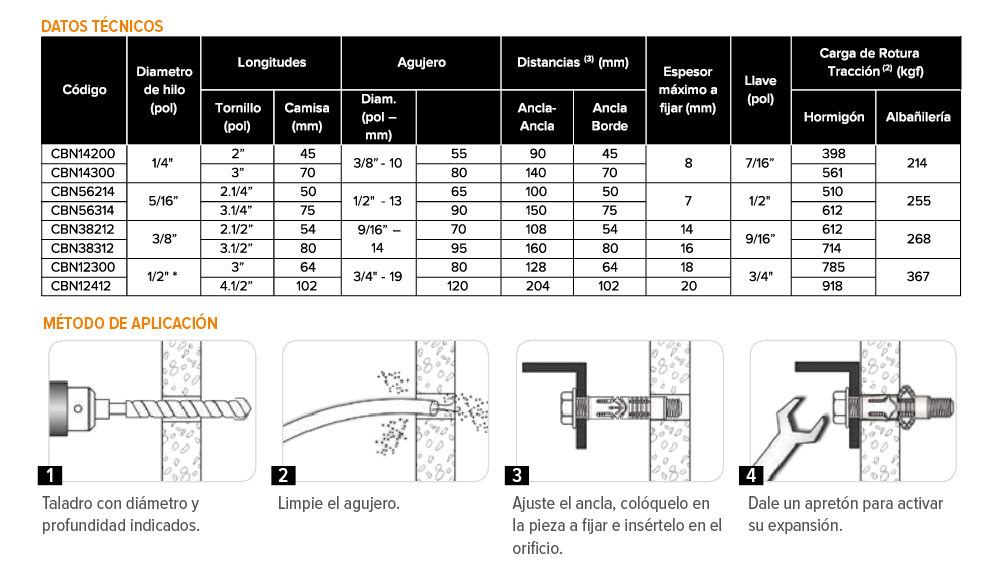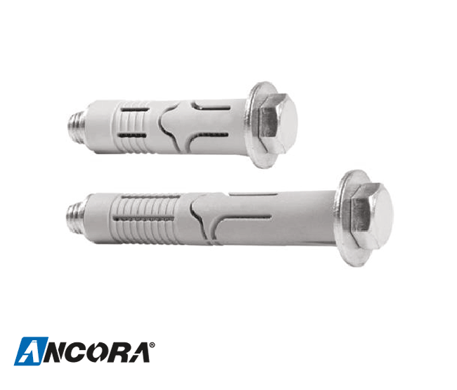 Ancla de alojamiento modelo CBN. Compuesto por tornillo hexagonal, arandela, camisa de nylon y cono. Construido en acero de bajo en carbono con tratamiento superficial recubierto de zinc blanco, resistencia a la corrosión de 48 horas CMB (corrosión del metal base) en salt spray según los parámetros vigentes de la norma ABNT NBR 8094 y una camisa de poliamida (Nylon). También disponible en acero inoxidable AISI 304 para una mayor resistencia a la corrosión. En la versión inoxidable, el tornillo / varilla, la tuerca y la arandela son de acero inoxidable y el cono se suministra en latón.